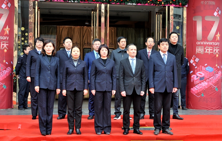 2019年1月1日新年第一天,華億集團(tuán)在步行街華億廣場(chǎng)舉行2019年新年升旗儀式暨華億國際購物中心17周年店慶慶典活動(dòng)。集團(tuán)董事長項(xiàng)義水,總裁項(xiàng)領(lǐng),集團(tuán)財(cái)務(wù)總監(jiān)劉建林,集團(tuán)總裁助理陳雪榮、崔巍崴,偉晨文化公司總經(jīng)理孫艷,華億國際全體經(jīng)營班子成員,以及員工代表參加了慶典活動(dòng)。華億國際副總經(jīng)理、旗艦店店總王萍女士主持慶典儀式。
