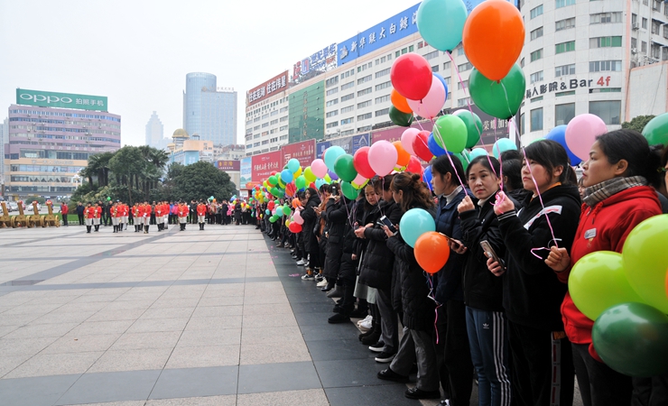在步行街華億廣場(chǎng)南門前,華億軍鼓樂隊(duì)整齊列隊(duì),數(shù)百名名員工代表手中舞動(dòng)著七彩氣球,節(jié)日氣氛熱烈。兩只喜慶的舞獅在廣場(chǎng)上歡樂的舞動(dòng)著,時(shí)而擺出萌萌的造型,引來市民們上前合影。上午9:08,主持人宣布升旗儀式正式開始,華億軍鼓樂隊(duì)奏響《國歌》和《華億之歌》,女子升旗手們踢著正步來到旗桿前。伴隨著雄壯的樂曲,五星紅旗和華億集團(tuán)司旗緩緩升起,迎風(fēng)飄揚(yáng)。