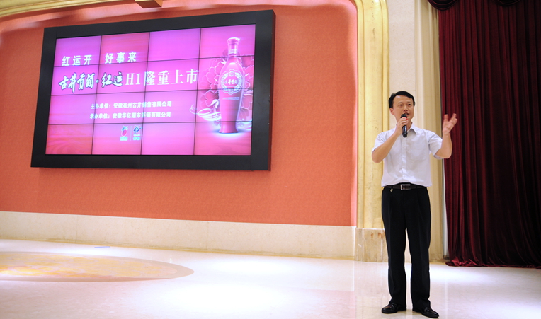 中午12時(shí),55桌的會(huì)場(chǎng)內(nèi)座無虛席,500多名市區(qū)各大酒店、流通商貿(mào)精英匯聚一堂,華億超市古井貢·紅運(yùn)H1項(xiàng)目上市品鑒會(huì)在大氣磅礴精彩紛呈的開場(chǎng)舞蹈中正式開始。古井銷售公司皖南營銷總監(jiān)薛曉峰發(fā)表講話。他表示,古井貢·紅運(yùn)是古井集團(tuán)繼年份原漿系列之后推出的又一戰(zhàn)略性全國主推產(chǎn)品,紅運(yùn)擁有全國老八大名酒強(qiáng)大的品牌優(yōu)勢(shì),它秉承了古井貢酒的釀造工藝,入口幽香淡雅,定價(jià)精準(zhǔn),是婚宴用酒、節(jié)日禮酒、親朋聚會(huì)用酒的最佳選擇。此次選擇與華億超市公司合作,主要是看中華億集團(tuán)在在商貿(mào)流通行業(yè)的強(qiáng)大實(shí)力。