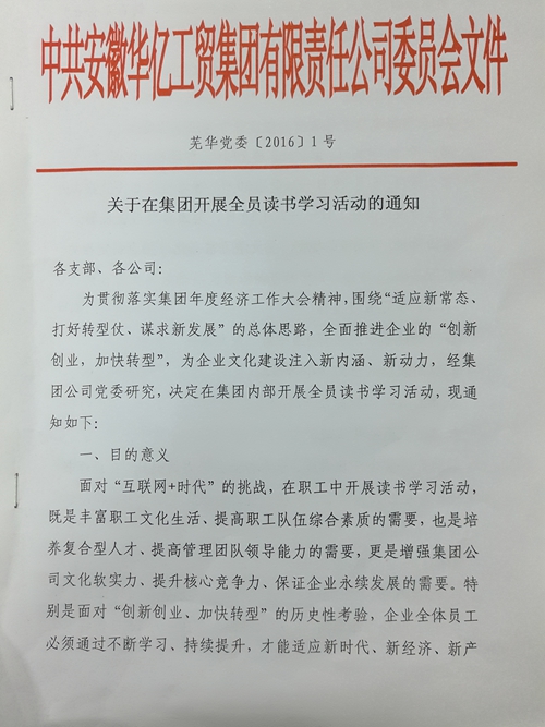 4月11日,華億集團(tuán)黨委、團(tuán)委根據(jù)集團(tuán)2016年度經(jīng)濟(jì)工作大會(huì)精神,圍繞“適應(yīng)新常態(tài)、打好轉(zhuǎn)型仗、謀求新發(fā)展”的總體思路,聯(lián)合下發(fā)了關(guān)于在集團(tuán)內(nèi)部開(kāi)展讀書(shū)學(xué)習(xí)活動(dòng)的通知。旨在通過(guò)開(kāi)展為期90天讀書(shū)學(xué)習(xí)活動(dòng),為全公司形成常態(tài)化學(xué)習(xí)風(fēng)氣打下基礎(chǔ)。通過(guò)不斷提升員工的學(xué)習(xí)力,為企業(yè)文化建設(shè)注入新內(nèi)涵、新動(dòng)力,從而加快加實(shí)推進(jìn)企業(yè)的“創(chuàng)新創(chuàng)業(yè),加快轉(zhuǎn)型”。