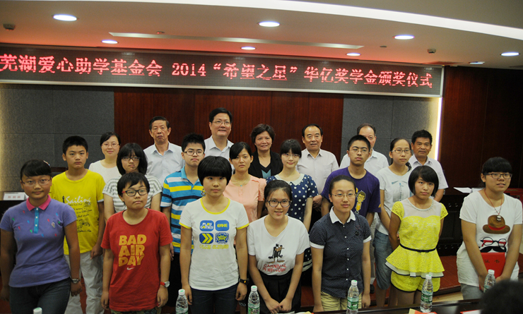 8月9日上午,蕪湖市愛心助學基金會2014年度“希望之星”華億獎學金頒獎儀式舉行。13位在今年中、高考中取得優異成績的學生及獲全國優秀少先隊員稱號的無為縣實驗小學學生丁浩然獲獎。